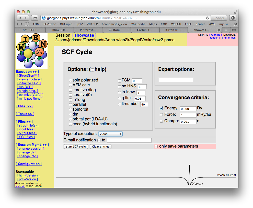 We have ported SC2IT-bash to w2web. A user can now select "cloud" as "Type of Execution". W2web+SC2IT then prepares a suitable cloud cluster in the EC2 cloud, copies over the WIEN2k input files, and runs the WIEN2k calculation in the cloud. The cloud cluster contains a precompiled version of WIEN2k for this purpose. The results are copied back when the calculation is complete, and the cloud cluster is then terminated. Note that the user does not have to access the cloud cluster at all. No command-line effort is required.
